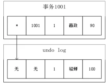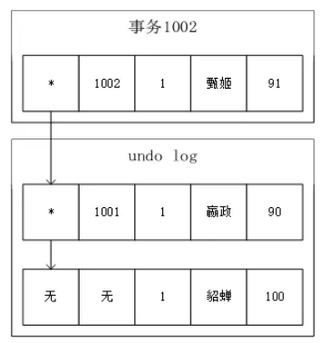 - 事务B执行如下语句此时undo log中有2条记录,它们通过回滚指针相连。