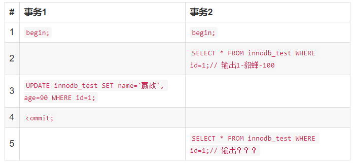 分析:这就是读提交,若有事务对数据进行更新(UPDATE)操作时,读操作事务要等待这个更新操作事务提交后才能读取数据,可以解决脏读问题。但在这个事例中,出现了一个事务范围内两个相同的查询却返回了不同数据,这就是不可重复读。