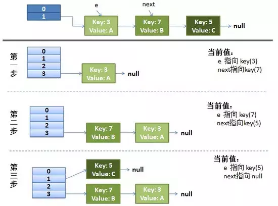 e.next = newTable[i] 导致 key(3).next 指向了 key(7)。注意:此时的key(7).next 已经指向了key(3), 环形链表就这样出现了。