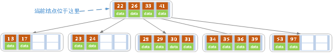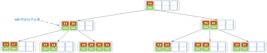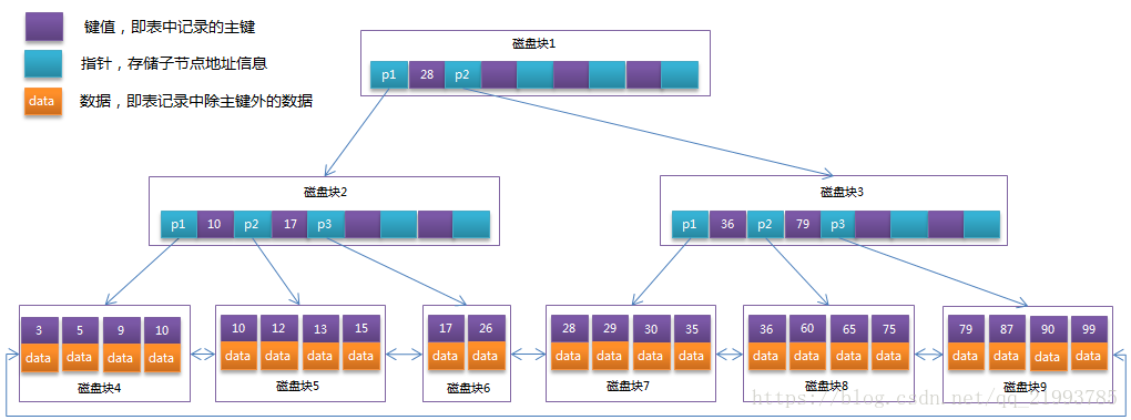 每个节点占用一个盘块的磁盘空间,一个节点上有两个升序排序的关键字和三个指向子树根节点的指针,指针存储的是子节点所在磁盘块的地址。两个关键词划分成的三个范围域对应三个指针指向的子树的数据的范围域。以根节点为例,关键字为17和35,P1指针指向的子树的数据范围为小于17,P2指针指向的子树的数据范围为17-35,P3指针指向的子树的数据范围为大于35。