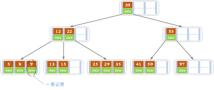 3、数据记录都存放在叶子节点中。