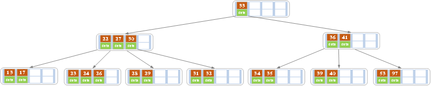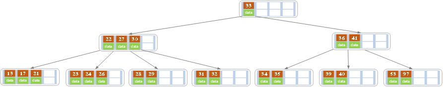 一般来说,对于确定的m和确定类型的记录,结点大小是固定的,无论它实际存储了多少个记录。但是分配固定结点大小的方法会存在浪费的情况,比如key为28,29所在的结点,还有2个key的位置没有使用,但是已经不可能继续在插入任何值了,因为这个结点的前序key是27,后继key是30,所有整数值都用完了。所以如果记录先按key的大小排好序,再插入到B树中,结点的使用率就会很低,最差情况下使用率仅为50%。