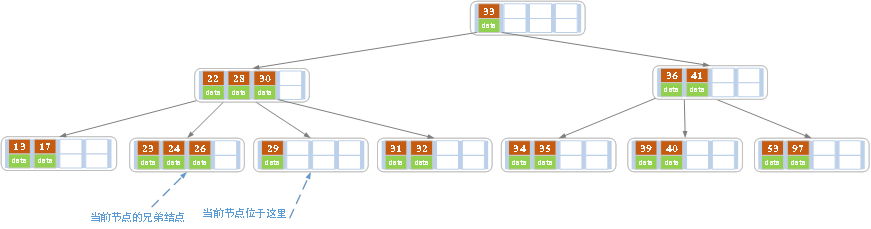 删除后发现,当前叶子结点的记录的个数小于2,而它的兄弟结点中有3个记录,我们可以从兄弟结点中借取一个key。所以父结点中的28下移,兄弟结点中的26上移,删除结束。结果如下图所示。