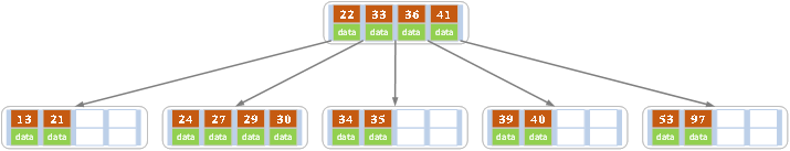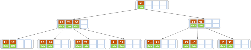下图是一个M=4 阶的B树(阶代表一个节点子节点的数量):