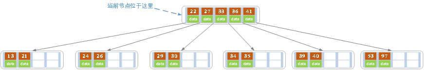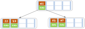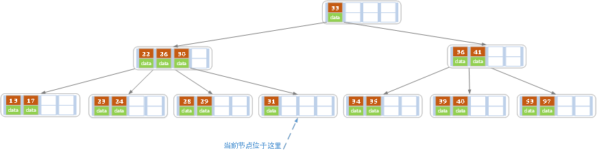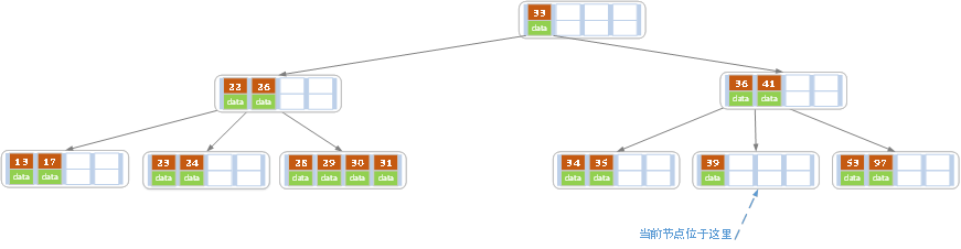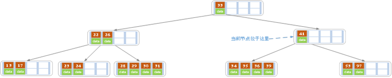 插入后超过了最大允许的关键字个数4,所以以key值为41为中心进行分裂,结果如下图所示,分裂后当前结点指针指向父结点(关键字41这个结点),满足B树条件,插入操作结束。当阶数m为偶数时,需要分裂时就不存在排序恰好在中间的key,那么我们选择中间位置的前一个key或中间位置的后一个key为中心进行分裂即可。
