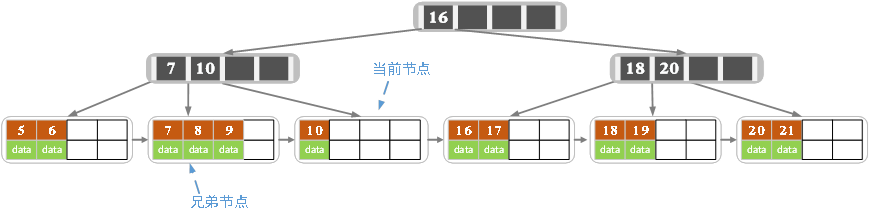 3)若兄弟结点中没有富余的key,则当前结点和兄弟结点合并成一个新的叶子结点,并删除父结点中的key(父结点中的这个key两边的孩子指针就变成了一个指针,正好指向这个新的叶子结点),将当前结点指向父结点(必为索引结点),执行第4步(第4步以后的操作和B树就完全一样了,主要是为了更新索引结点)。