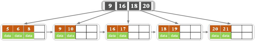 对于B+树来说,只需定位到3的叶子节点,然后通过链表指针,依次遍历得到元素5/6/8/9/11;如此一来,就不用像B树那样一个个元素进行查找。