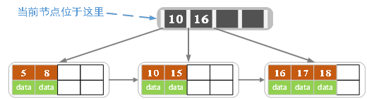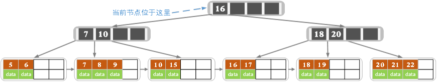 插入16后超过了关键字的个数限制,所以要进行分裂。在叶子结点分裂时,分裂出来的左结点2个记录,右边3个记录,中间key成为索引结点中的key,分裂后当前结点指向了父结点(根结点)。结果如下图所示。