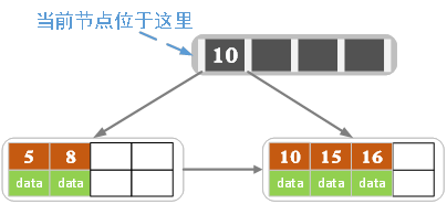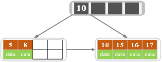 当然我们还有另一种分裂方式,给左结点3个记录,右结点2个记录,此时索引结点中的key就变为15。