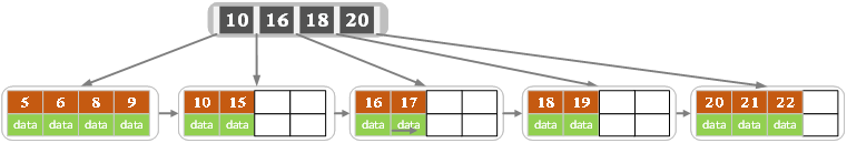当前结点的关键字个数大于5,进行分裂。分裂成两个结点,左结点2个记录,右结点3个记录,关键字16进位到父结点(索引类型)中,将当前结点的指针指向父结点。