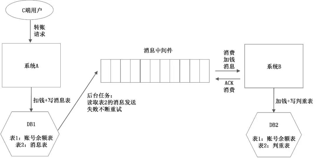 系统A增加一张消息表,系统A不再直接给消息中间件发送消息,而是把消息写入到这张消息表中。把DB1的扣钱操作(表1)和写入消息表(表2)这两个操作放在一个数据库事务里,保证两者的原子性。