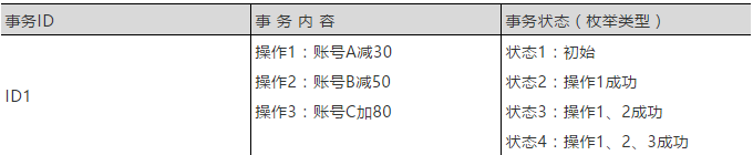 初始是状态1,每调用成功1个服务则更新1次状态,最后所有系统调用成功,状态更新到状态4,状态2、3是中间状态。当然,也可以不保存中间状态,只设置两个状态:Begin和End。事务开始之前的状态是Begin,全部结束之后的状态是End。如果某个事务一直停留在Begin状态,则说明该事务没有执行完毕。