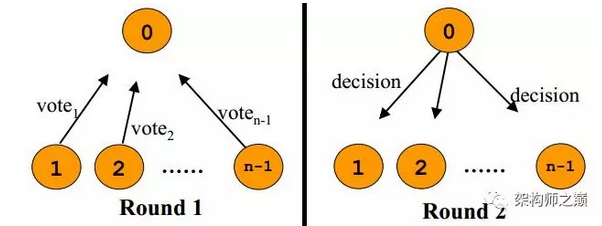 在两阶段提交协议中,系统一般包含两类机器(或节点):一类为协调者(coordinator),通常一个系统中只有一个;另一类为事务参与者(participants,cohorts或workers),一般包含多个,在数据存储系统中可以理解为数据副本的个数。协议中假设每个节点都会记录写前日志(write-ahead log)并持久性存储,即使节点发生故障日志也不会丢失。协议中同时假设节点不会发生永久性故障而且任意两个节点都可以互相通信。