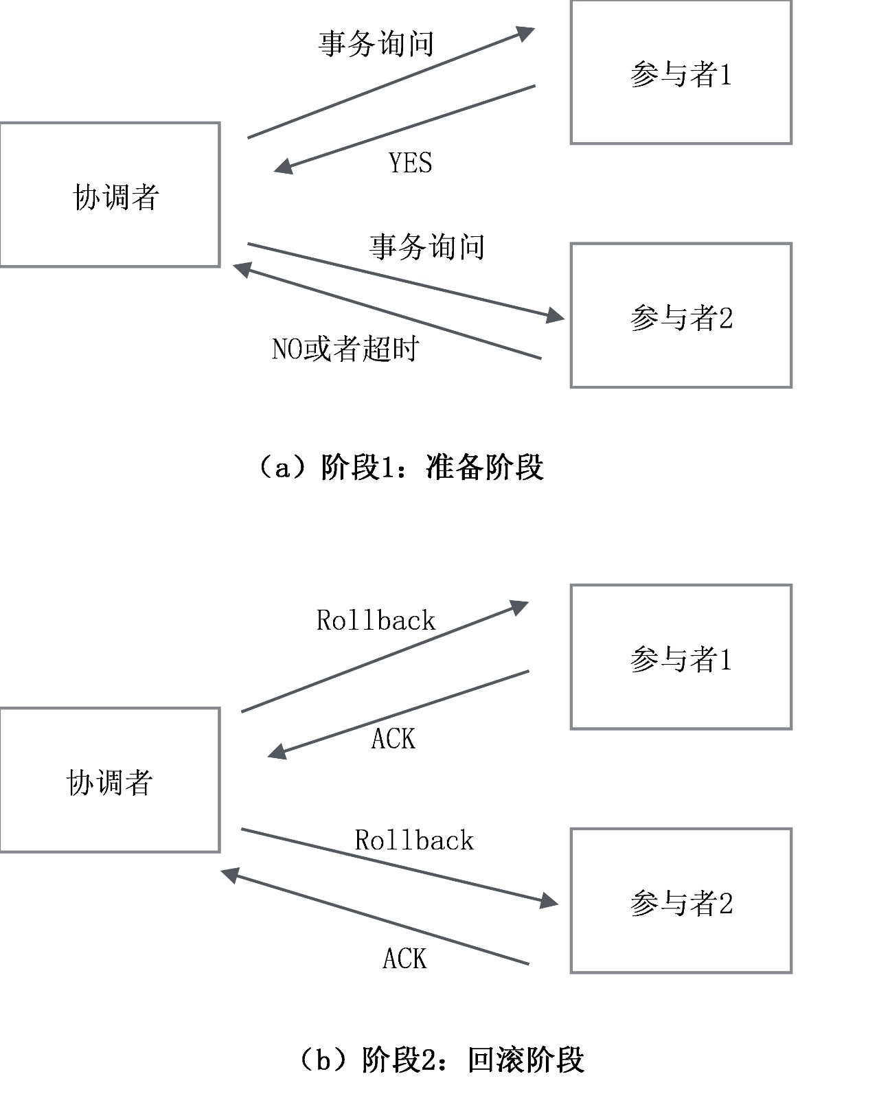如果有一个参与者回复的是NO,或者超时了,则事务协调者向所有参与者发起事务回滚操作,所有参与者各自回滚事务,然后发送ACK。