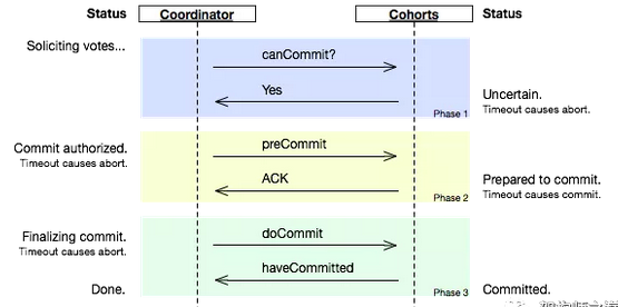 对于协调者(Coordinator)和参与者(Cohort)都设置了超时机制(在2PC中,只有协调者拥有超时机制,即如果在一定时间内没有收到cohort的消息则默认失败)。在2PC的准备阶段和提交阶段之间,插入预提交阶段,使3PC拥有CanCommit、PreCommit、DoCommit三个阶段。PreCommit是一个缓冲,保证了在最后提交阶段之前各参与节点的状态是一致的。