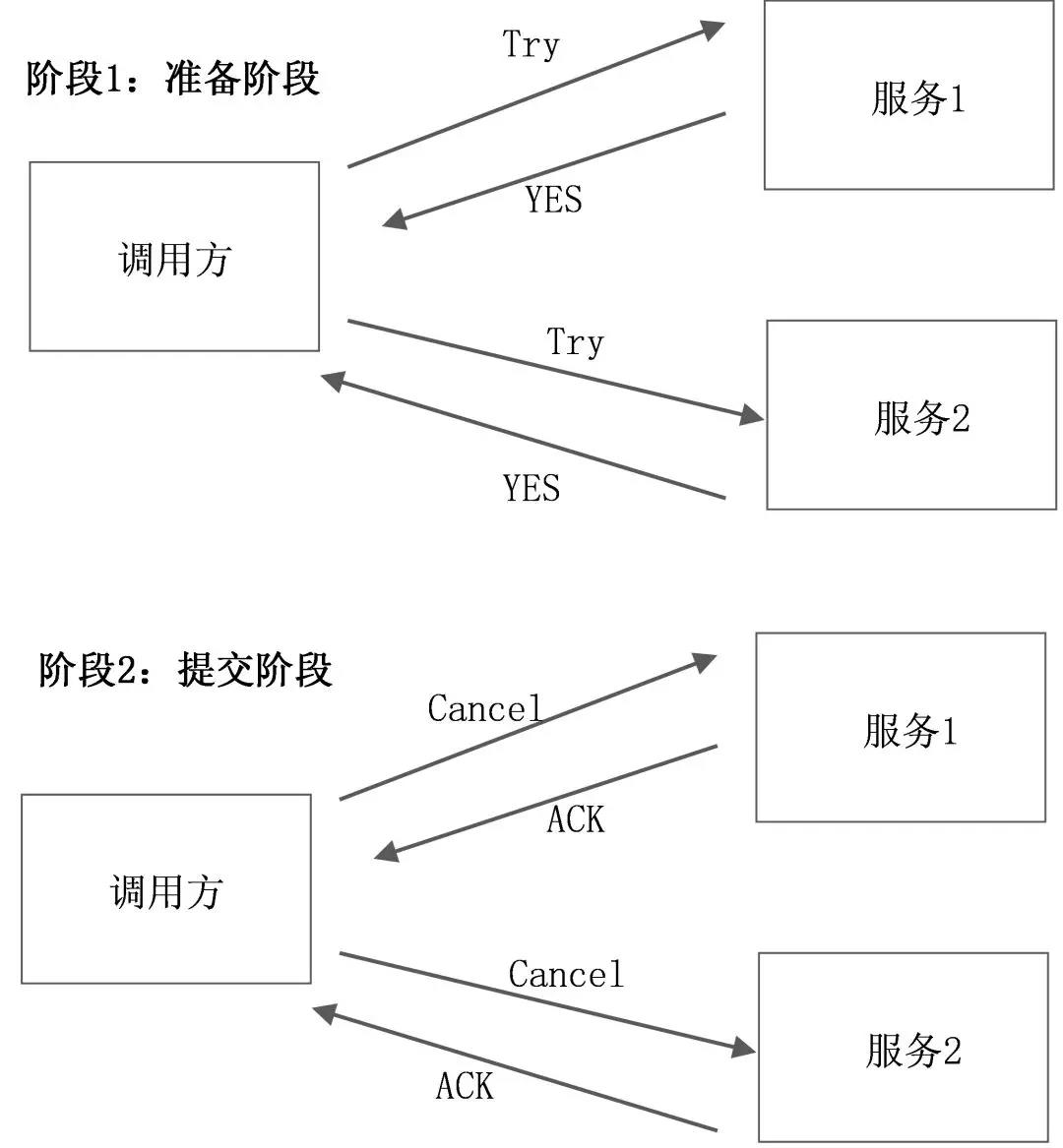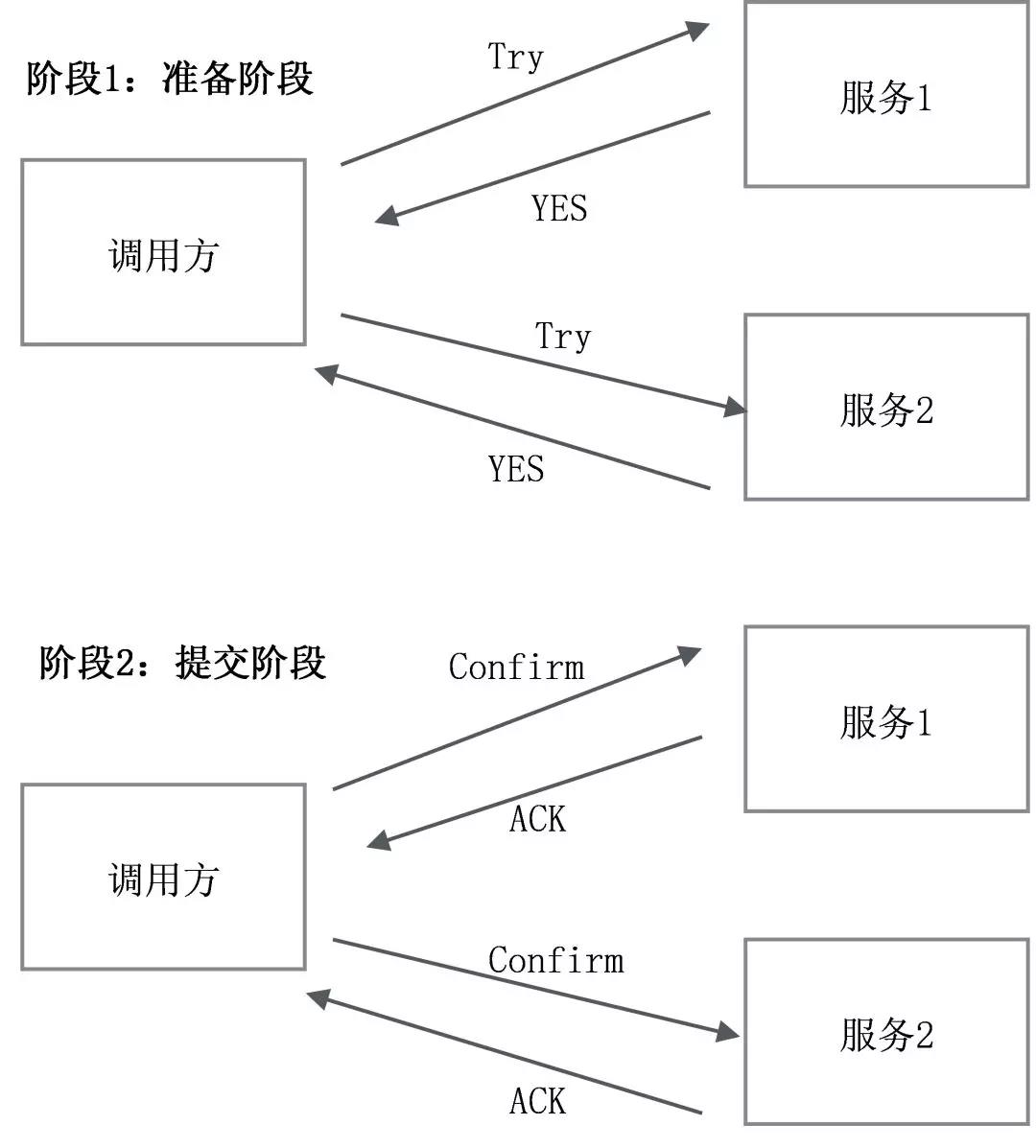 (1)准备阶段:调用方调用所有服务方提供的Try接口,该阶段各调用方做资源检查和资源锁定,为接下来的阶段2做准备。