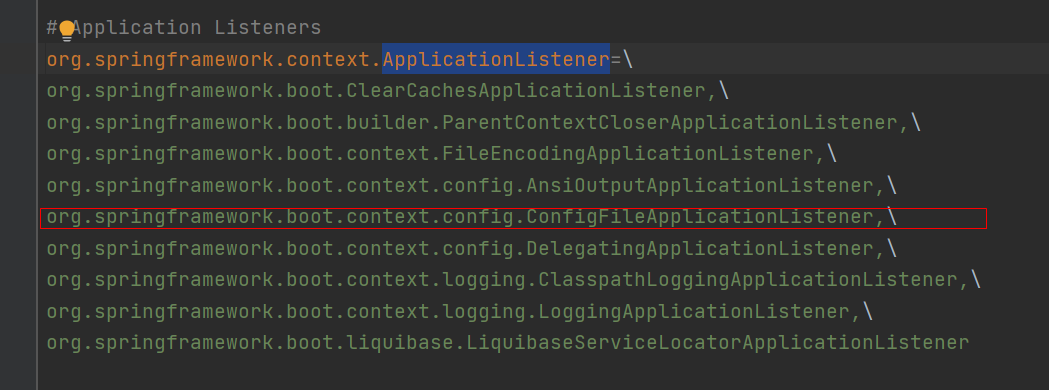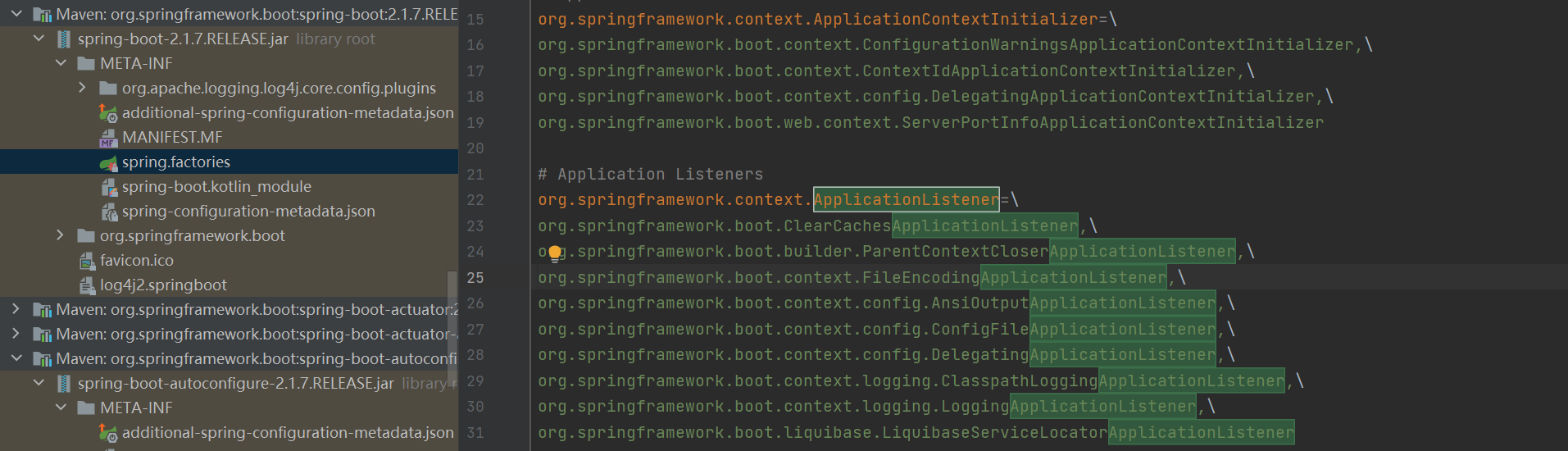 在SpringApplication实例化对象过程中,this.setListeners(this.getSpringFactoriesInstances(ApplicationListener.class));会获取并加载META-INF/spring.factories中key为org.springframework.context.ApplicationListener下的所有Listener。
