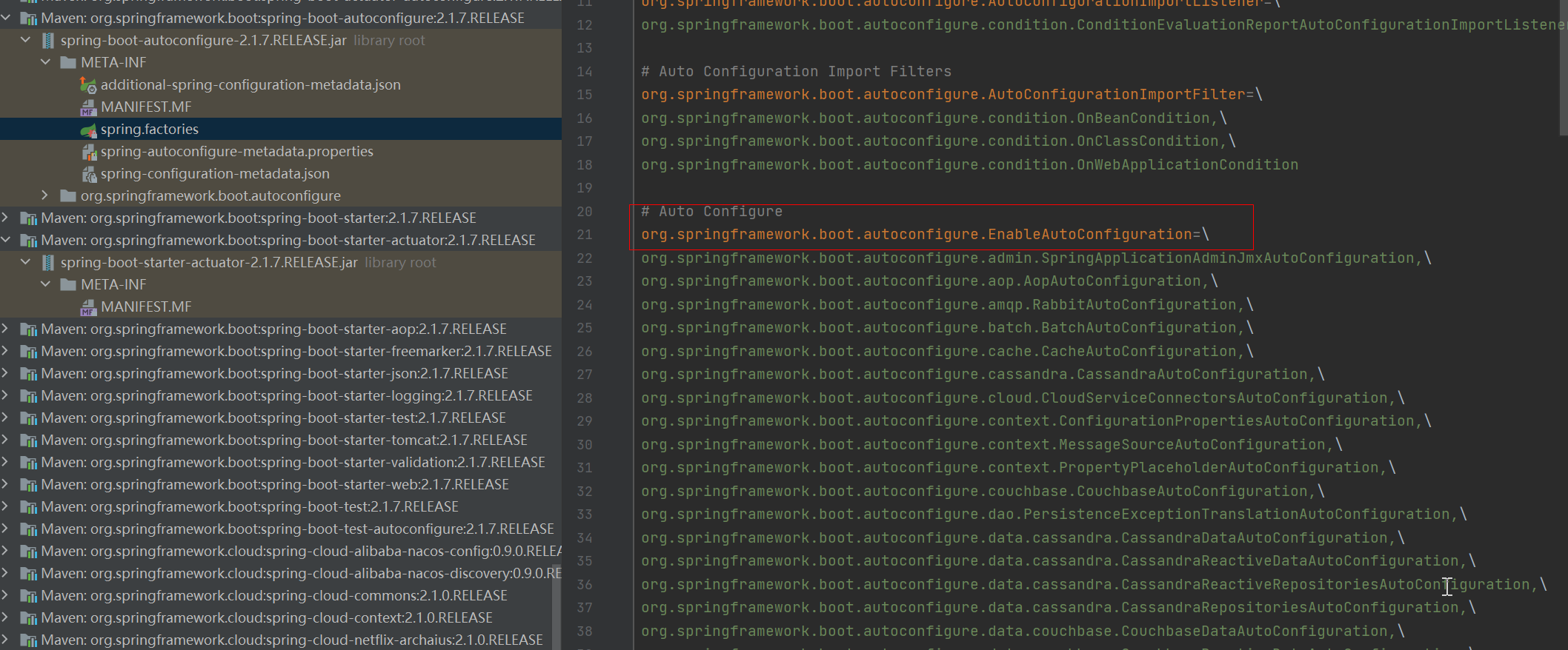@EnableAutoConfiguration也是一个组合注解由元注解和@AutoConfigurationPackage、@Import注解构成,Spring中有很多Enable开头的注解,其作用大都是借助@Import来收集并注册特定场景相关的bean。@EnableAutoConfiguration的主要作用就是借助@Import来收集并注册所有符合自动装配条件的bean。