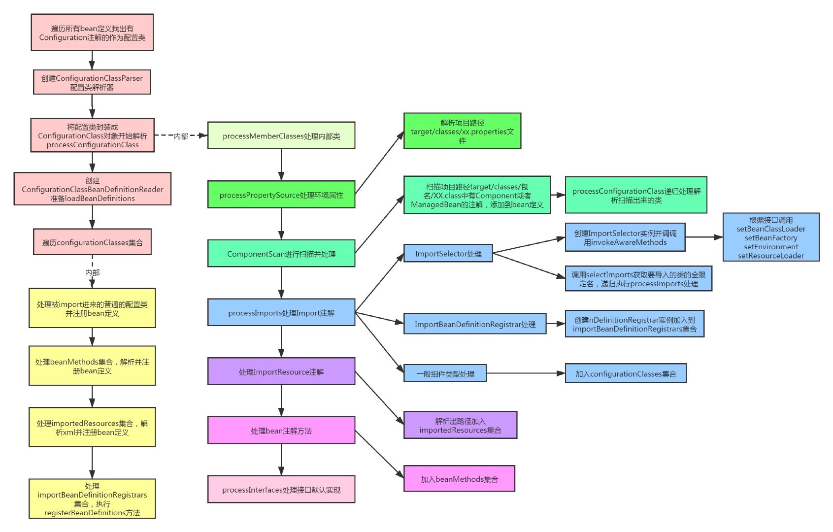 1 2 3 4 5 6 7 8 9 10 11 12 13 14 15 16 17 18 19 20 21 22 23 24 25 26 27 28 29 30 31 32 33 34 35 36 37 38 39 40 41 42 43 44 45 46 protected void invokeBeanFactoryPostProcessors (ConfigurableListableBeanFactory beanFactory) { PostProcessorRegistrationDelegate.invokeBeanFactoryPostProcessors(beanFactory, getBeanFactoryPostProcessors()); ... } public static void invokeBeanFactoryPostProcessors ( ConfigurableListableBeanFactory beanFactory, List<BeanFactoryPostProcessor> beanFactoryPostProcessors) { ... invokeBeanDefinitionRegistryPostProcessors(currentRegistryProcessors, registry); ... } private static void invokeBeanDefinitionRegistryPostProcessors ( Collection<? extends BeanDefinitionRegistryPostProcessor> postProcessors, BeanDefinitionRegistry registry) { for (BeanDefinitionRegistryPostProcessor postProcessor : postProcessors) { postProcessor.postProcessBeanDefinitionRegistry(registry); } } @Override public void postProcessBeanDefinitionRegistry (BeanDefinitionRegistry registry) { ... processConfigBeanDefinitions(registry); } public void processConfigBeanDefinitions (BeanDefinitionRegistry registry) { ... Set<BeanDefinitionHolder> candidates = new LinkedHashSet(configCandidates); HashSet alreadyParsed = new HashSet(configCandidates.size()); do { parser.parse(candidates); parser.validate(); Set<ConfigurationClass> configClasses = new LinkedHashSet(parser.getConfigurationClasses()); configClasses.removeAll(alreadyParsed); if (this .reader == null ) { this .reader = new ConfigurationClassBeanDefinitionReader(registry, this .sourceExtractor, this .resourceLoader, this .environment, this .importBeanNameGenerator, parser.getImportRegistry()); } this .reader.loadBeanDefinitions(configClasses); ... } ... }