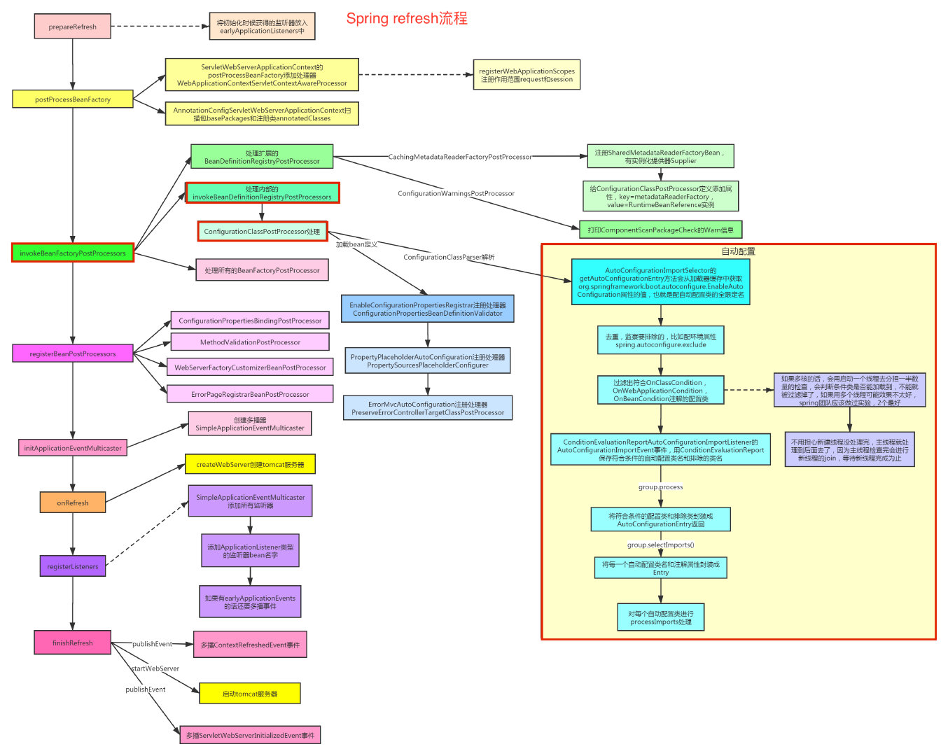 在SpringBoot中,我们都知道他的包扫描是从主类所在的包开始扫描的,prepareContext()方法中,会先将主类解析成BeanDefinition,然后在refresh()方法的invokeBeanFactoryPostProcessors()方法中解析主类的BeanDefinition获取basePackage的路径。这样就完成了定位的过程。其次SpringBoot的各种starter是通过SPI扩展机制实现的自动装配,SpringBoot的自动装配同样也是在invokeBeanFactoryPostProcessors()方法中实现的。还有一种情况,在SpringBoot中有很多的@EnableXXX注解,细心点进去看的应该就知道其底层是@Import注解,在invokeBeanFactoryPostProcessors()方法中也实现了对该注解指定的配置类的定位加载。