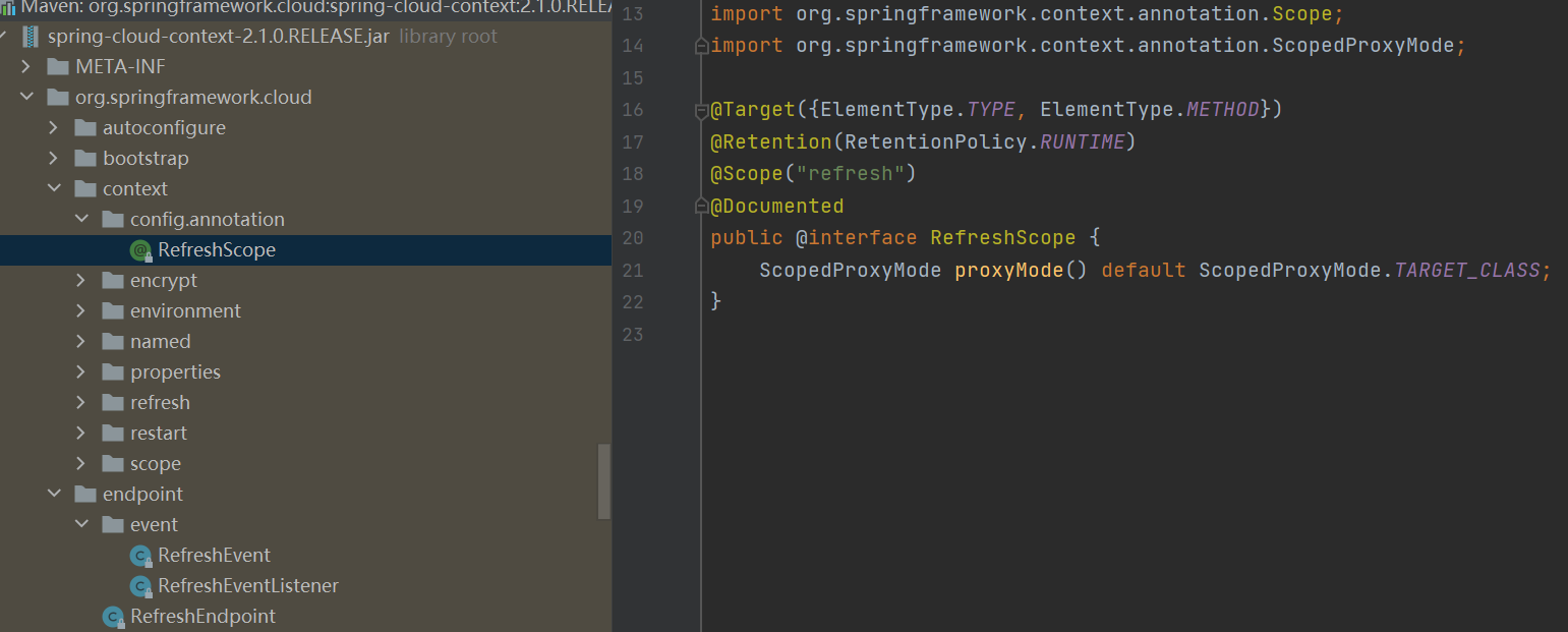 @RefreshScope位于spring-cloud-context,可将@Bean定义放入org.springframework.cloud.context.scope.refresh.RefreshScope中。 RefreshScope(org.springframework.cloud.context.scope.refresh), 即@Scope("refresh")是spring cloud提供的一种特殊的scope实现,用来实现配置、实例热加载。 用这种方式注解的Bean可以在运行时刷新,并且使用它们的任何组件都将在下一个方法调用前获得一个新实例,该实例将完全初始化并注入所有依赖项。
