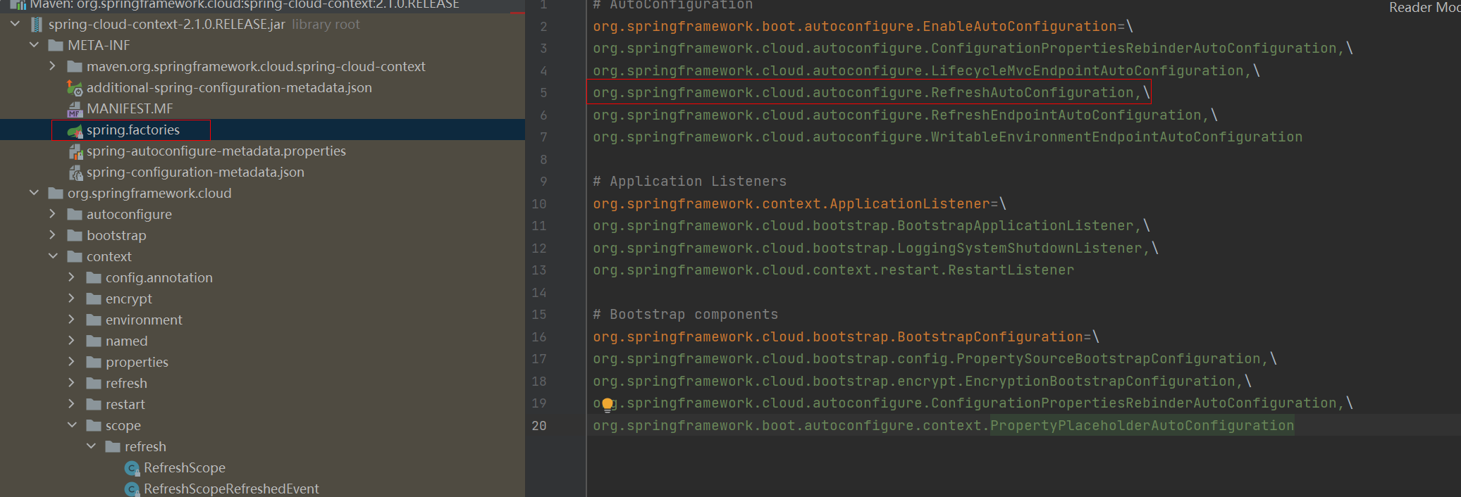 在spring-cloud-context-2.1.0.RELEASE-sources/META-INF/spring.factories我们看到RefreshAutoConfiguration。